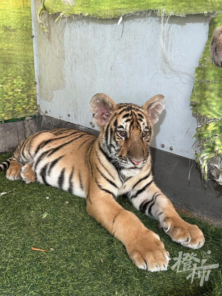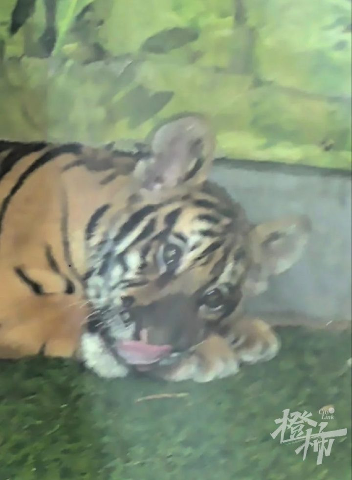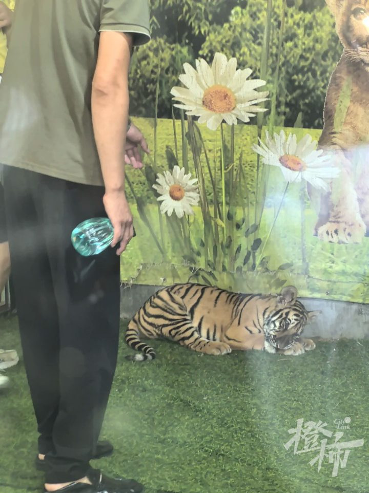 橙柿记者注意到,网友晒出了现场图片:工作人员手持着喷水壶,面对着地上的小老虎,小老虎趴在地上,耷拉着脑袋很不情愿的神情。